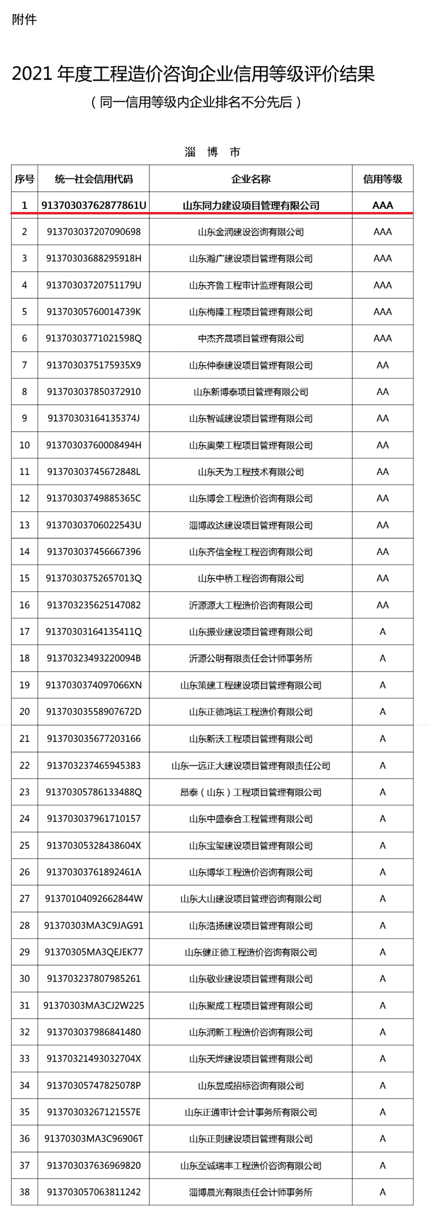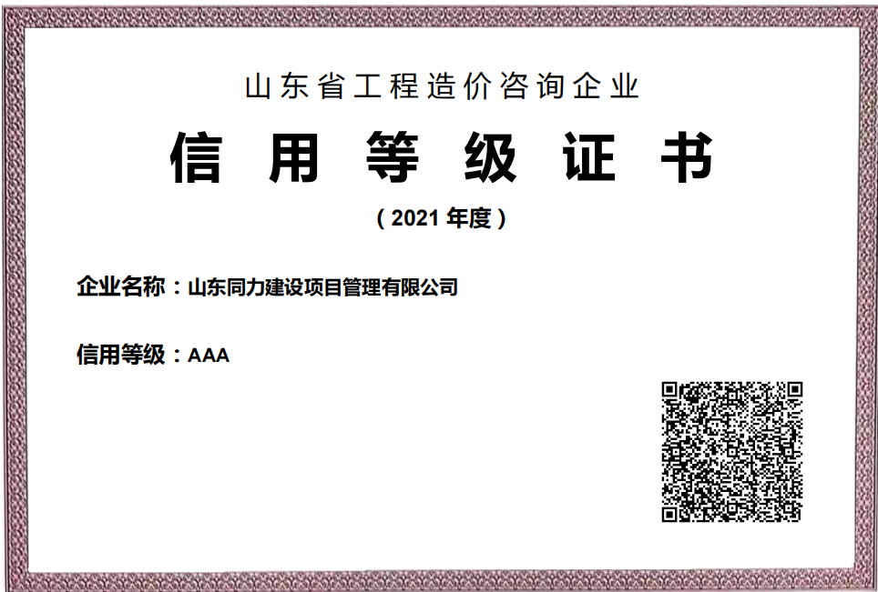 近日,山东省住房和城乡建设厅公布2021年度工程造价咨询企业信用等级评价结果,公司喜获“企业信用等级评价AAA级信用企业”。