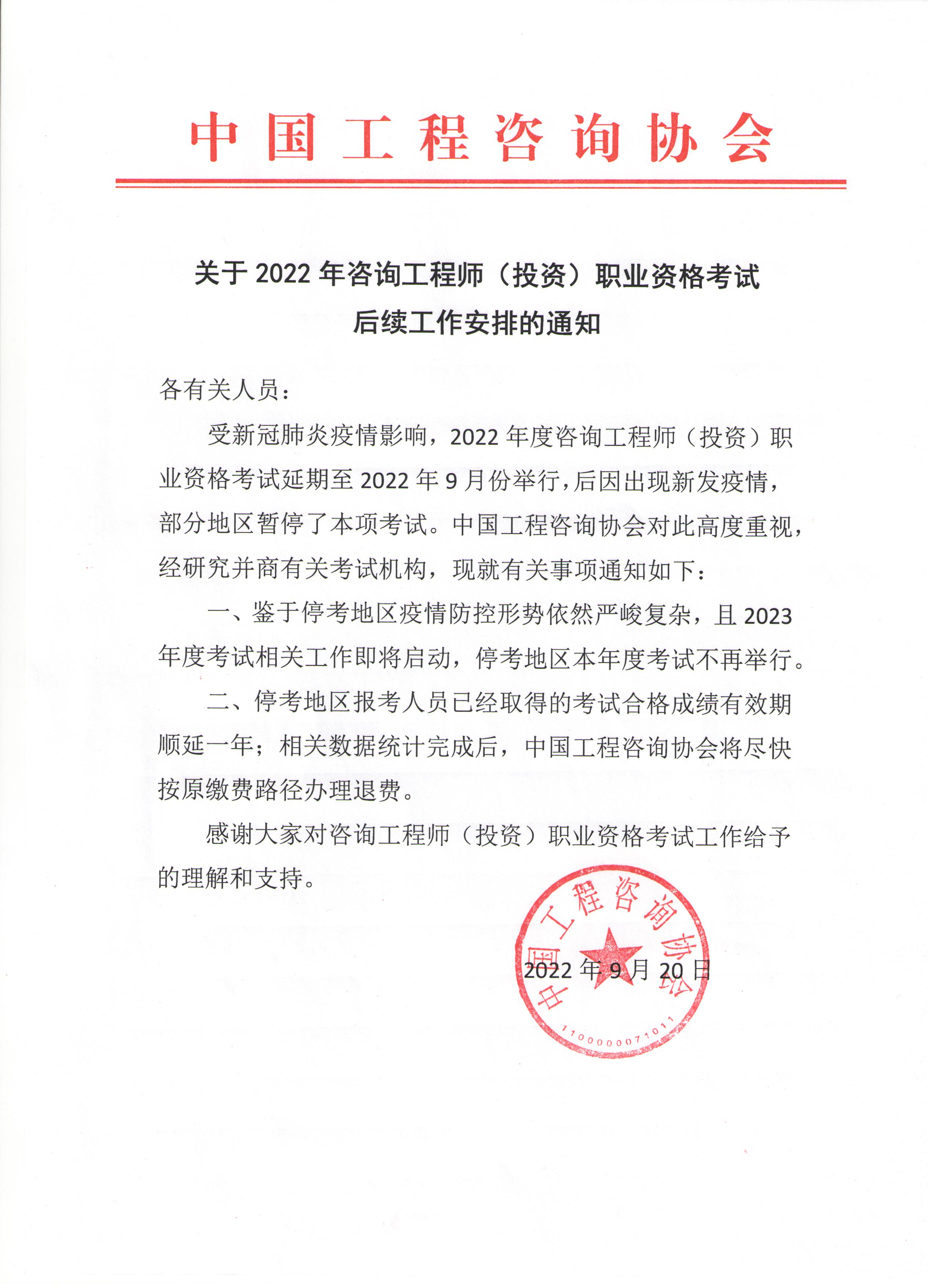 关于2022年咨询工程师(投资)职业资格考试后续工作安排的通知